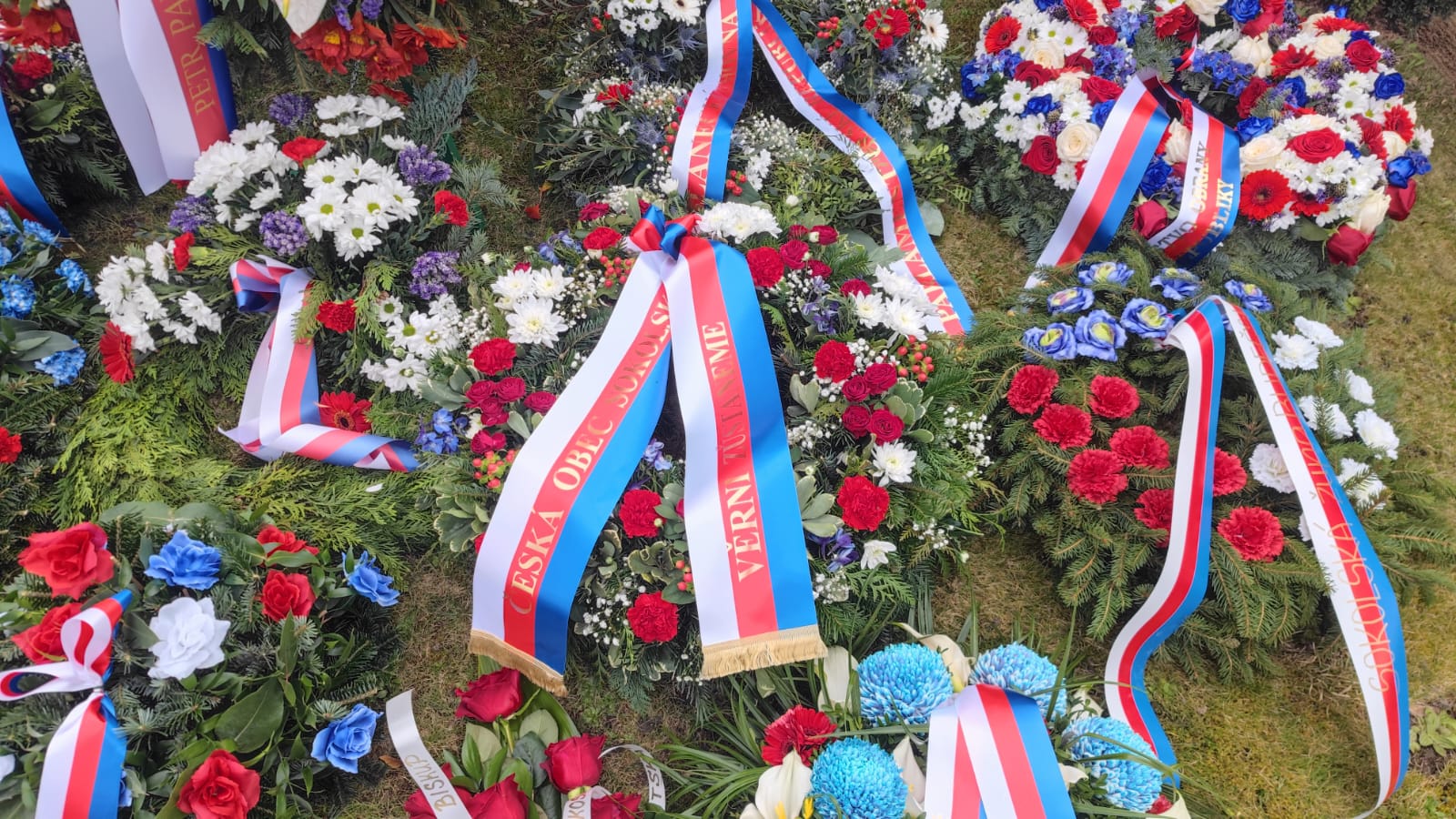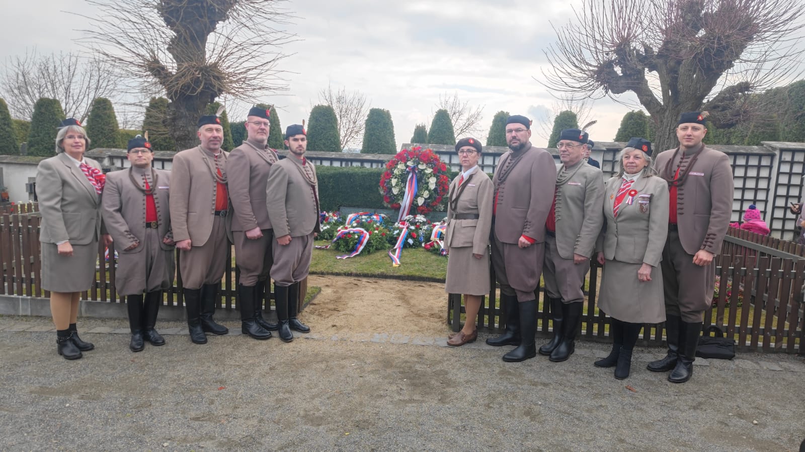 Členové Sokolské stráže byli přítomni při položení květin u hrobu v Lánech. Zástupci T.J. Sokol Hanspaulka: Š. Viceníková, J. Frynta a R. Mattielo